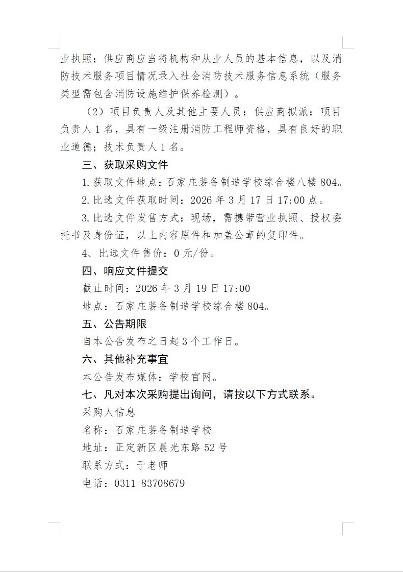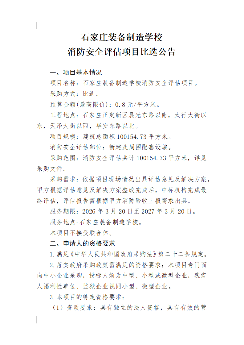 石家庄装备制造学校消防安全评估项目比选公告 发布时间:2026-03-17